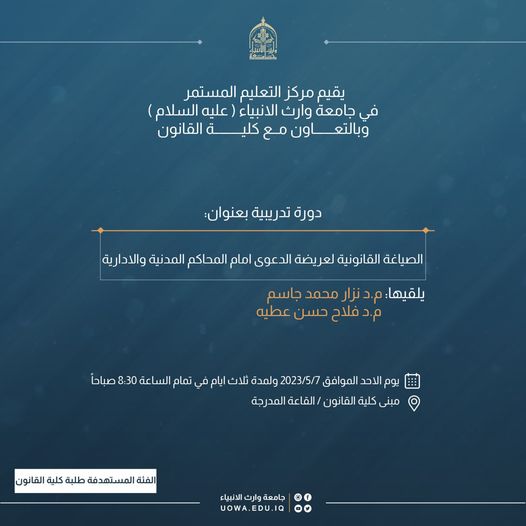 يقيم مركز التعليم المستمر في جامعة وارث الأنبياء (عليه السلام)، وبالتعاون مع كلية القانون دورة تدريبية بعنوان (الصياغة القانونية لعريضة الدعوى أمام المحاكم المدنية والإدارية)