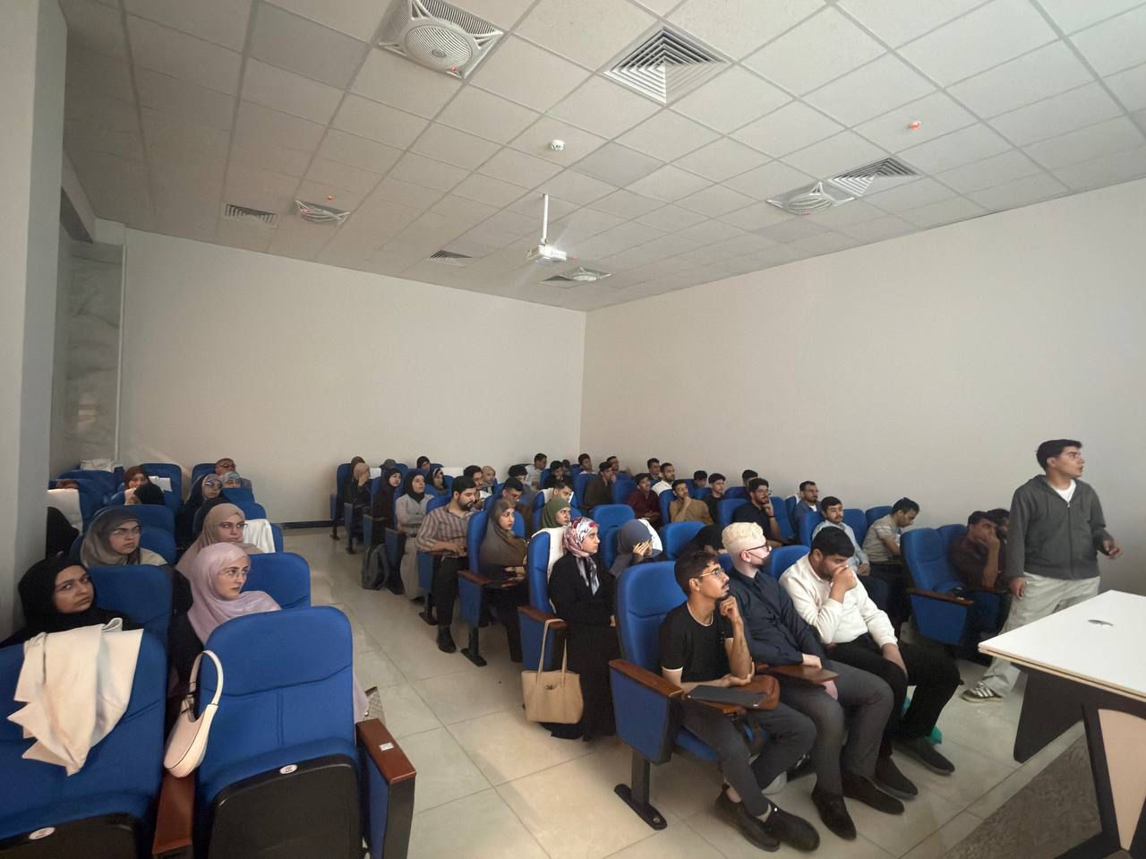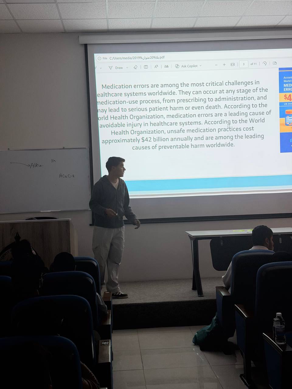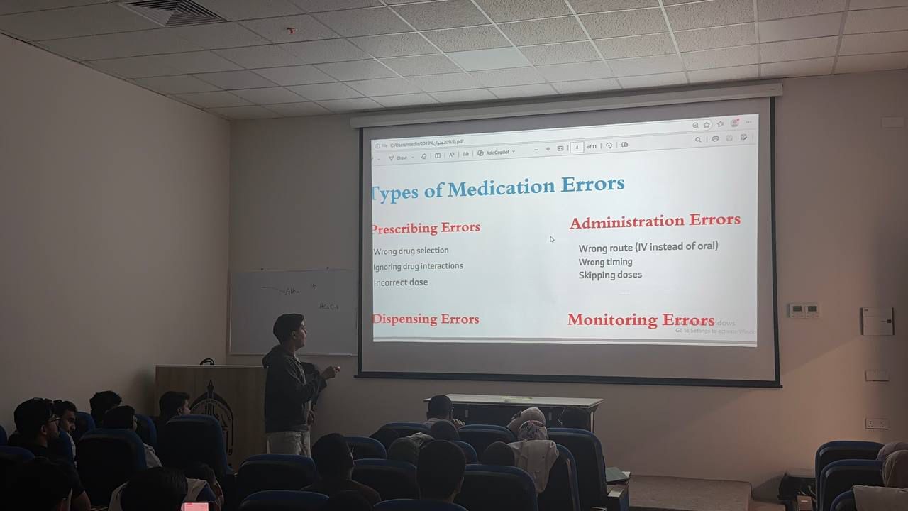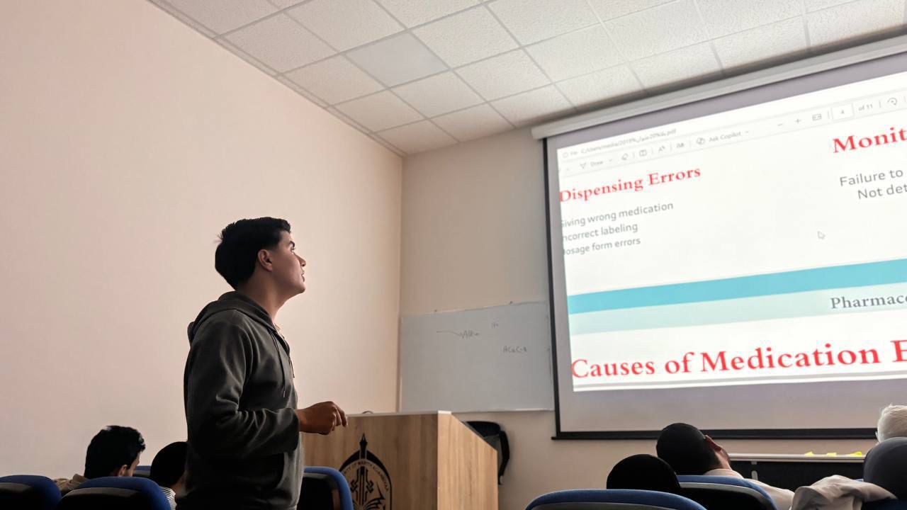 As part of the ongoing student scientific activities, and in the presence of the Dean of the College of Pharmacy, student Murtaza Hassan Abdul-Hadi Mansi delivered a distinguished presentation entitled "Types of Pharmaceutical Errors."