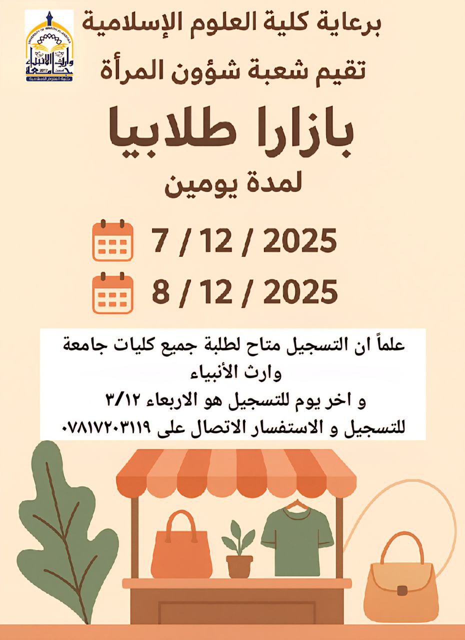 Under the patronage of the College of Islamic Sciences, the Women’s Affairs Division is organizing a student bazaar on campus for two days: