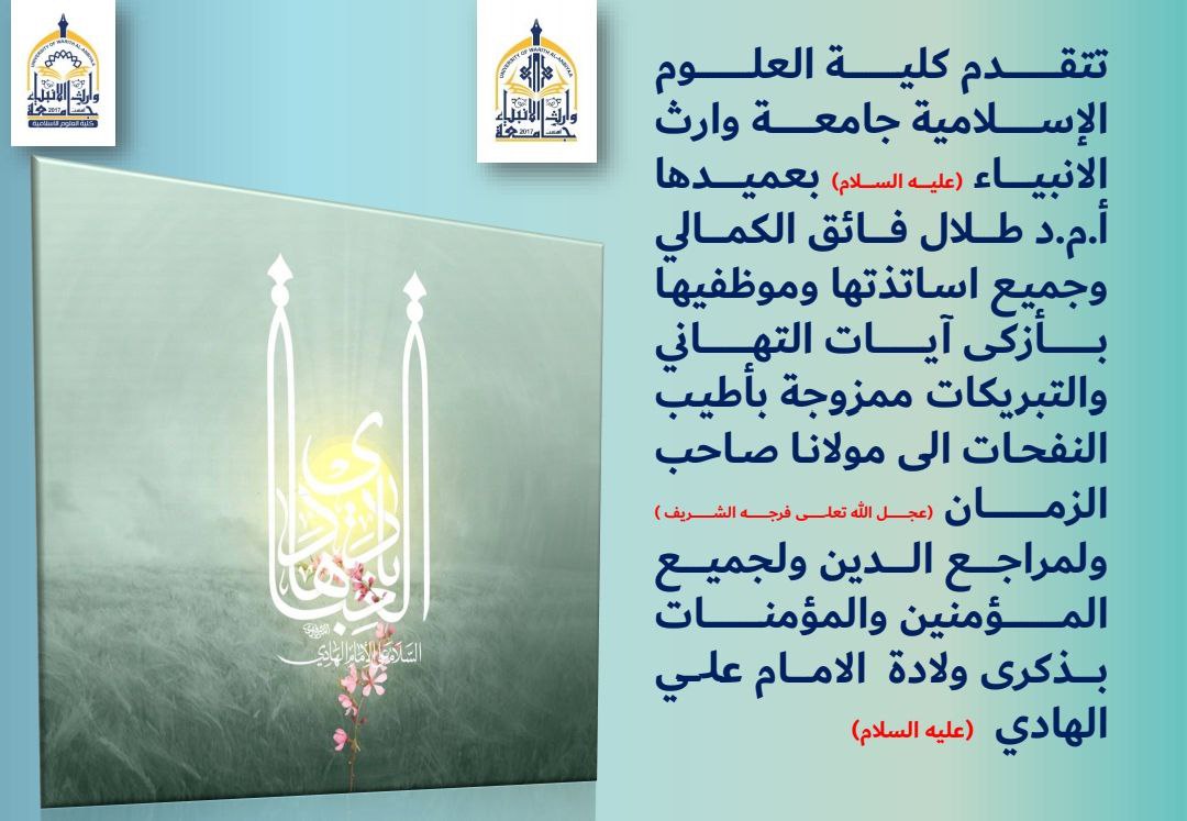 The College of Islamic Sciences, Warith Al-Anbiya University (peace be upon him), with its Dean, Assistant Professor Dr. Talal Faeq Al-Kamali, and all its professors and employees, extends the most sincere congratulations and blessings mixed with the best breezes to our Master, the Master of the Age (may Allah hasten his honorable reappearance), to the religious authorities, and to all believing men and women on the anniversary of the birth of Imam Ali Al-Hadi (peace be upon him).
