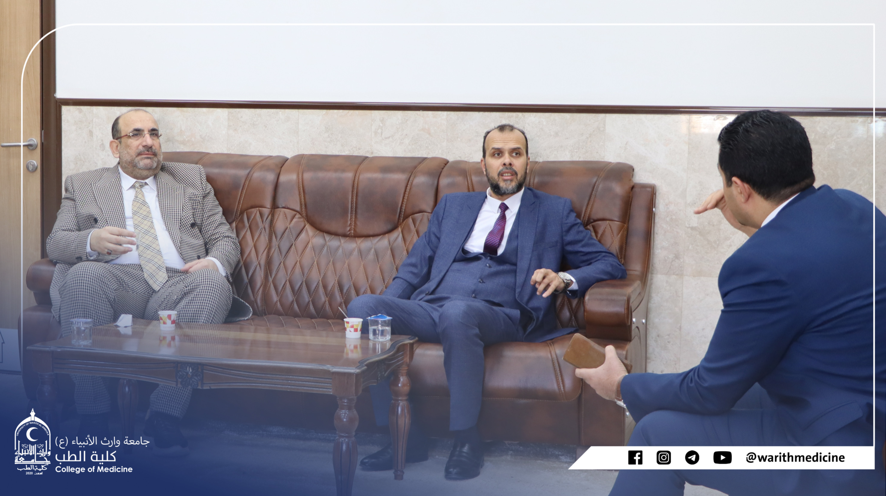 The Dean of the Faculty of Medicine at the University of Warith al-Anbiya (peace be upon him) received Professor Dr. Ali Abd Saadoun al-Ghazi, the respected Dr. Maad Nassif Jassim, a consultant to the British Royal College, where a presentation was made about the possibility of establishing a center for emergency and disaster medicine in cooperation with the British Royal College and opening channels of cooperation between the Royal British College and the University of Warith al-Anbiya. (A) Where the delegation was briefed on the infrastructure and human resources at the university.