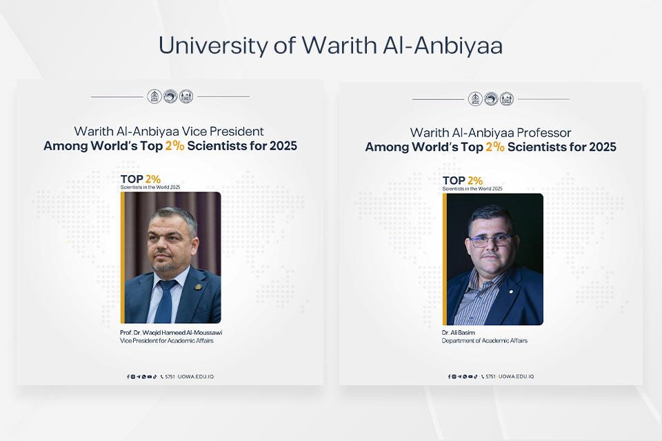 In a new academic achievement added to the record of successes at the University of Warith Al-Anbiyaa (PBUH), the names of Prof. Dr. Waqid Hameed Al-Moussawi, Vice President for Academic Affairs, along with Dr. Ali Basim, were included in the list of the world’s top 2% scientists for 2025, according to the annual study conducted by a research team at Stanford University, USA.